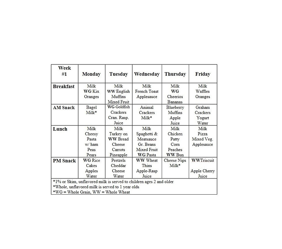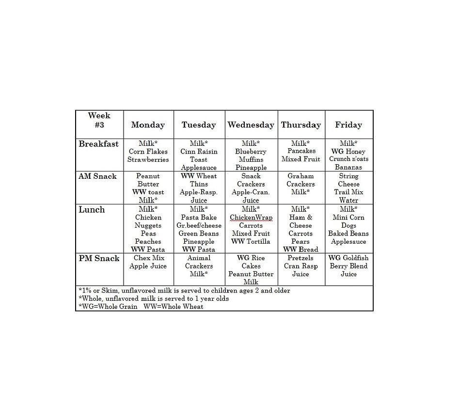 Each child in the center is provided with breakfast, lunch and snacks on a three week rotating menu. All food is approved by the program standards and puts our children's health first.